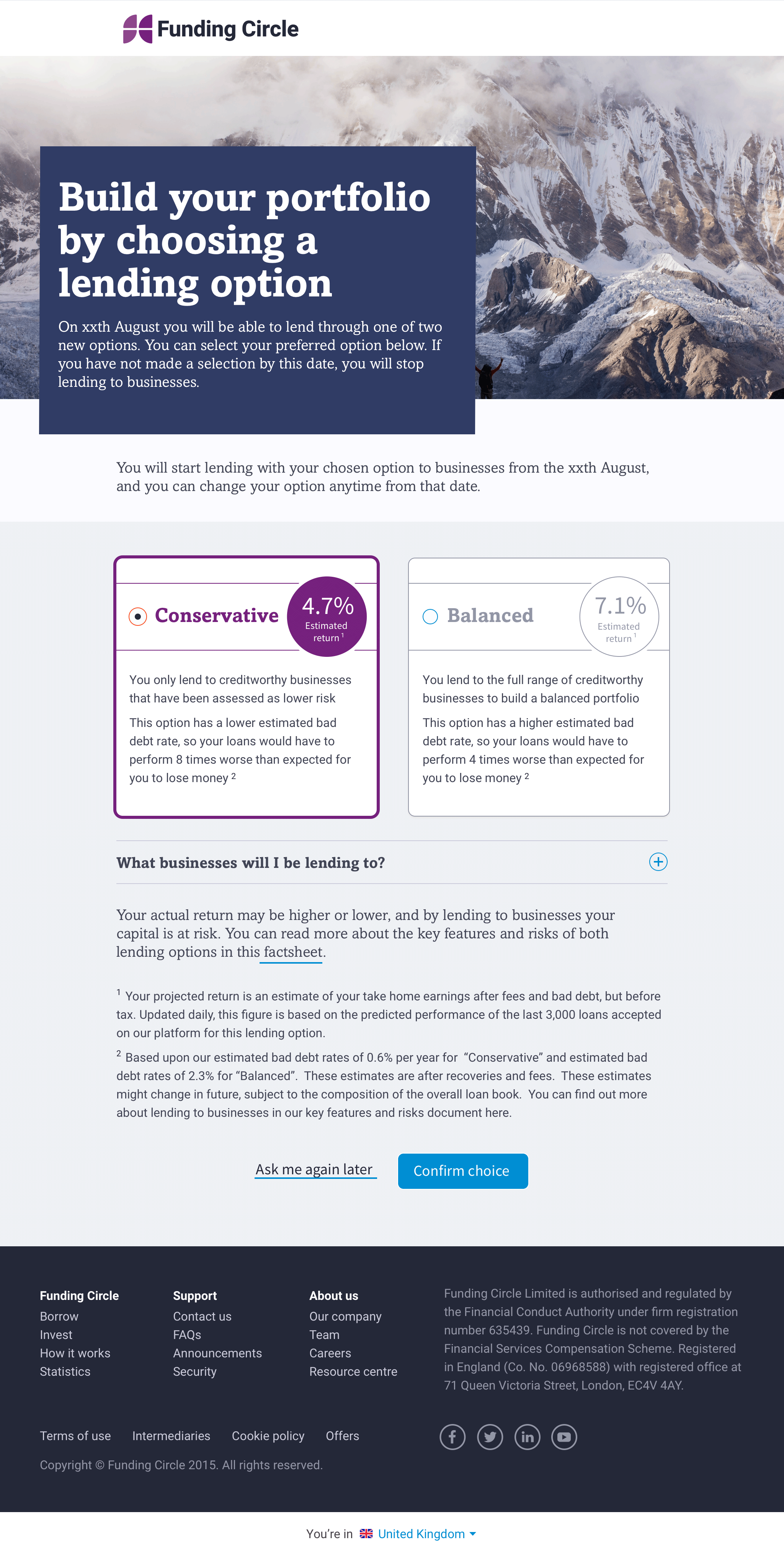 Investors were asked to select an option based on their risk appetite, Conservative or Balanced. While Balanced lent money across the entire risk spectrum, Conservative investors could opt to lend exclusively to businesses underwritten at lower risk. Here default rates are lower however returns on lending were also proportionately smaller.