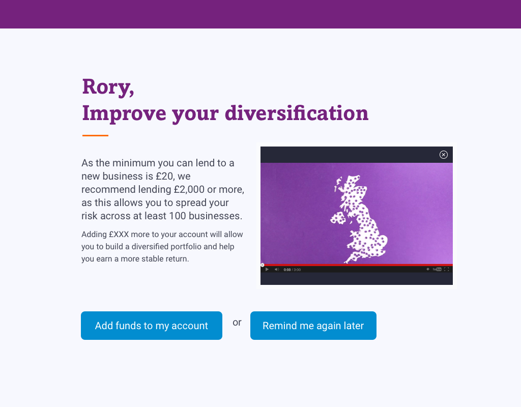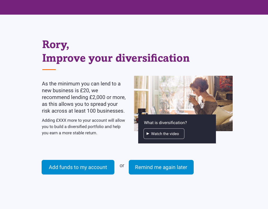 Figure 12: Sign In prompt targeting users who have not met recommended diversification targets. Previous “soft touch” initiatives had not been successful in impacting returns.